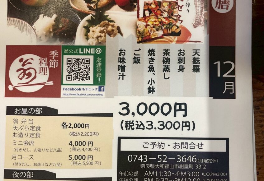 いつもありがとうございます😊 季節料理翁です😊 今月のお膳です。宜しくお願いします😊 天麩羅 お刺身 茶碗蒸し 焼き魚・小鉢 ご飯 お味噌汁 3,300円(税込)